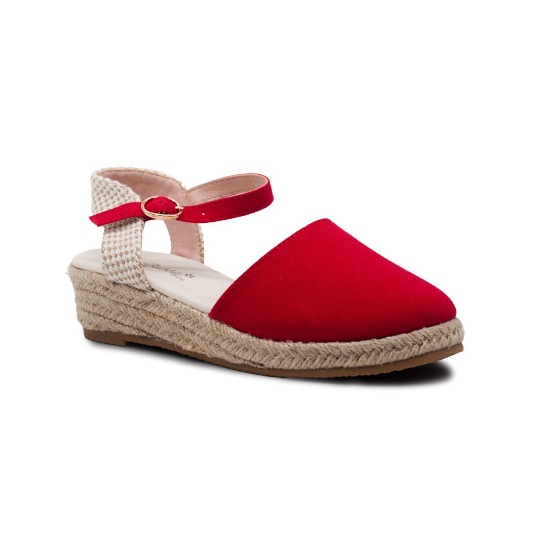 Alpargatas de Yute para niña con cierre de hebilla al tobillo y cuña. Disponibles en color hielo, oro, blanco y rojo.