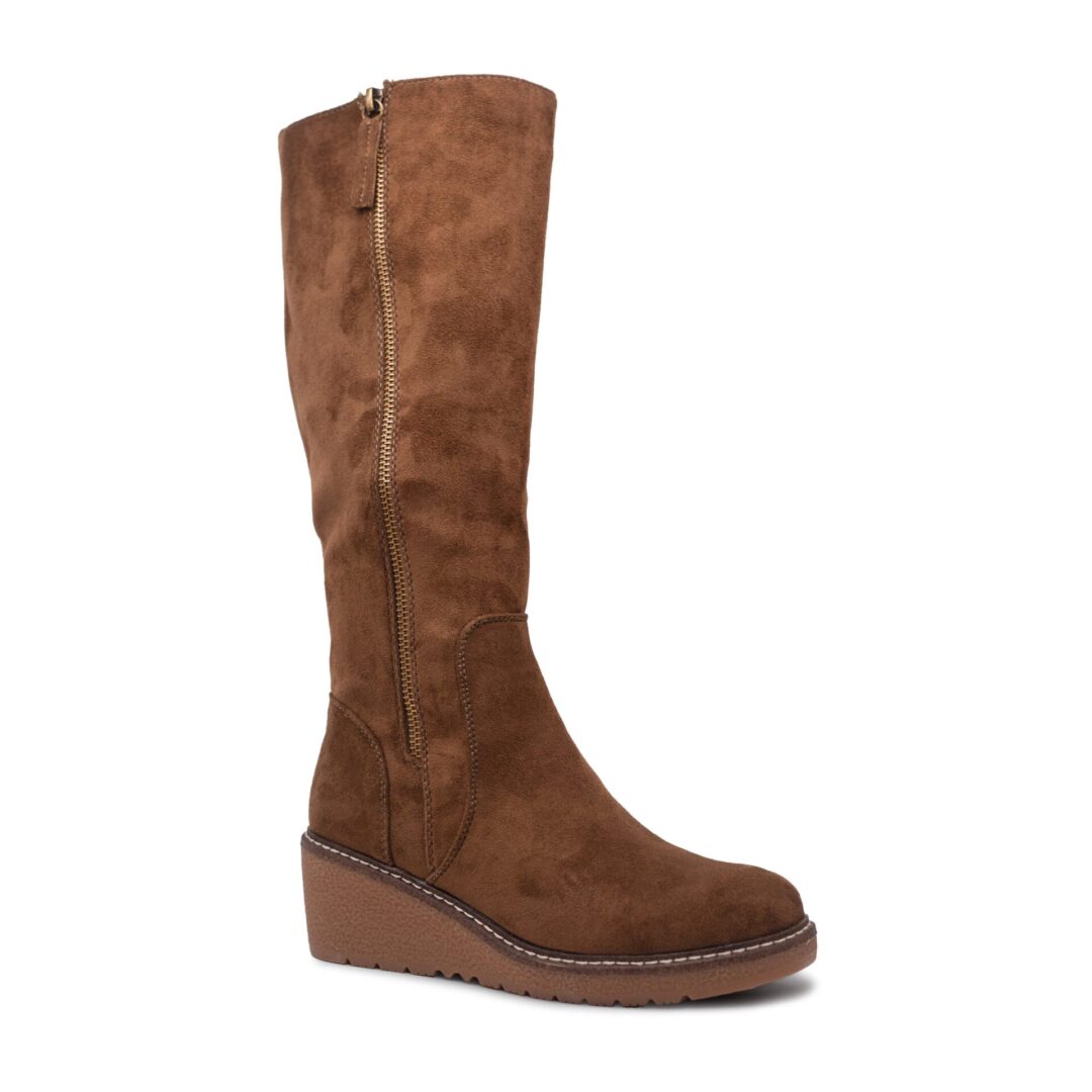 Botas altas de Antelina con cremallera lateral interna y cuña de 5 cm. Disponibles en color taupe y negro.