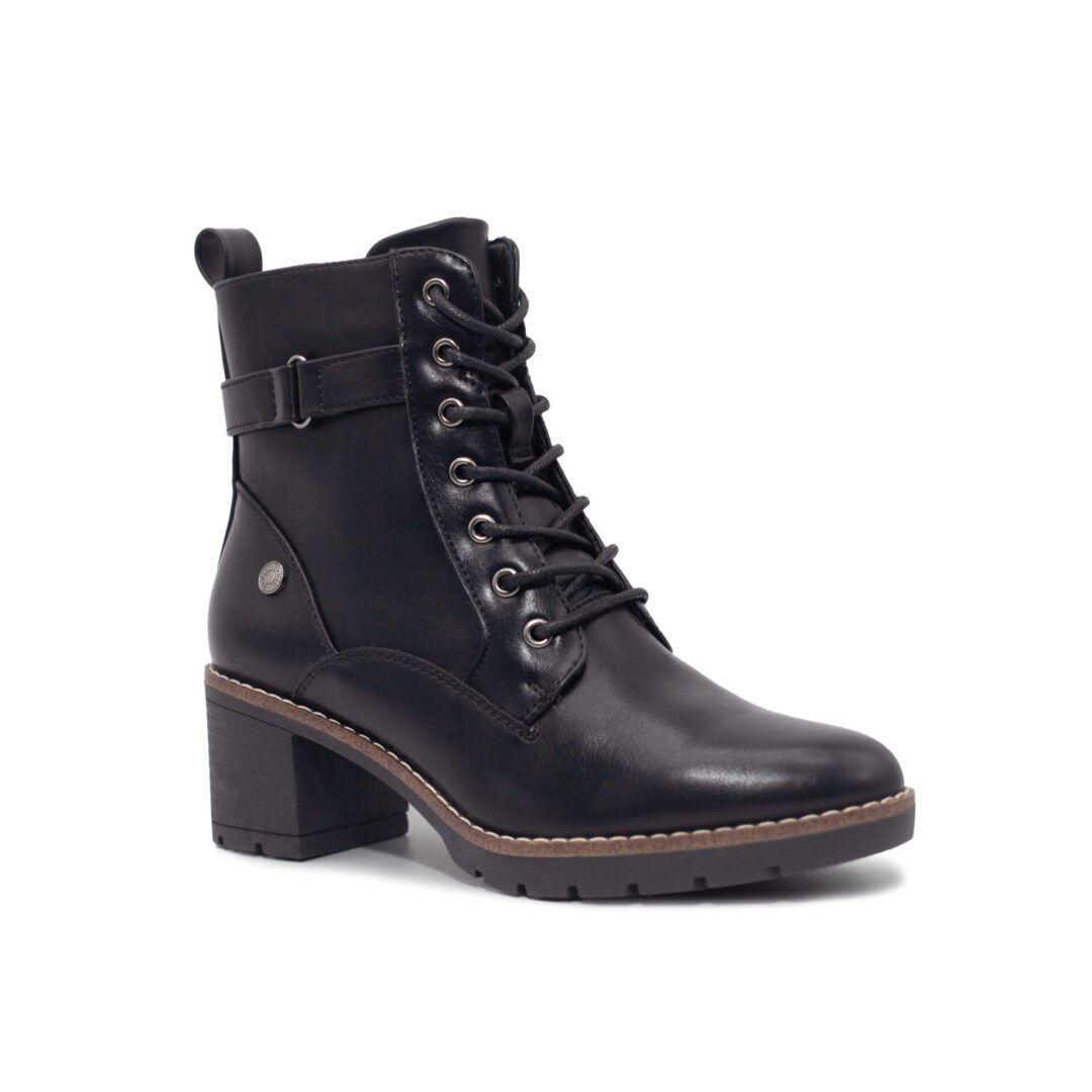 Botas militares de mujer en acabado negro, con diseño elegante y detalles de hebilla lateral. Incorpora cordones frontales, cierre de cremallera lateral para mayor comodidad y un tacón de 5,5 cm que aporta altura sin renunciar a la estabilidad.