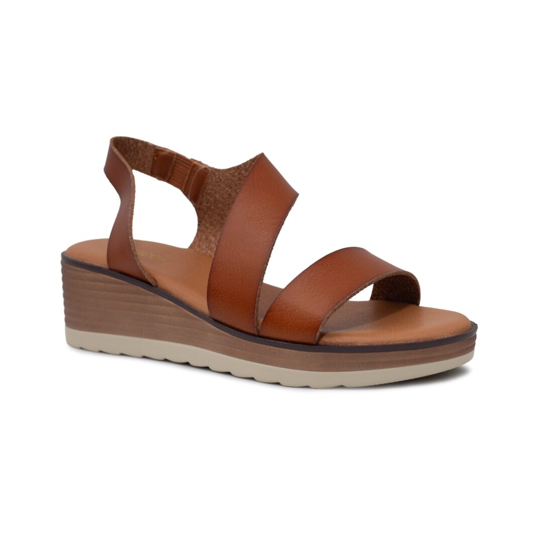 Sandalias de mujer con pala color camel, cierre elástico al tobillo y cuña.