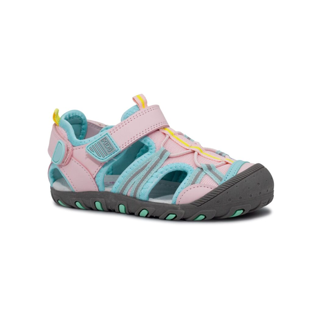 Sandalias de niña rosas con puntera reforzada, doble cierre de velcro y planta de piel.