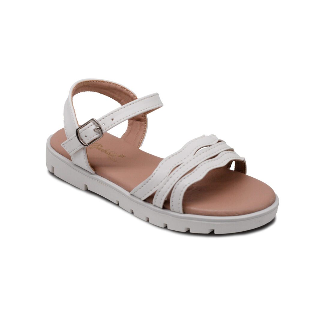 Sandalias planas para niña en color blanco, con diseño de tiras en la pala y cierre ajustable con hebilla en el tobillo. Presentan una suela cómoda y ligera, ideales para el uso diario en verano, combinando estilo sencillo y frescura.