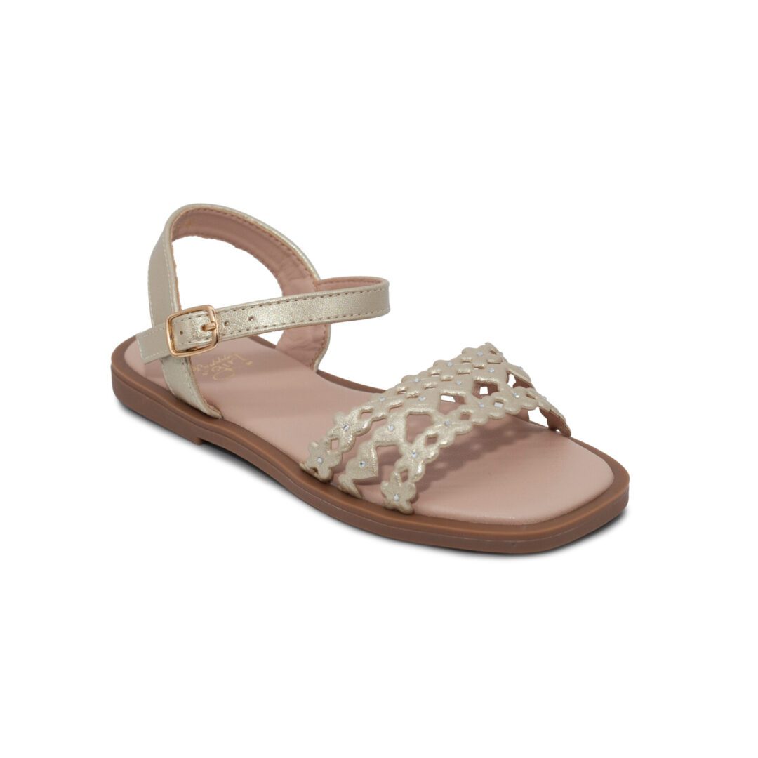 Sandalias de niña con pala de corazones, planta acolchada y cierre de hebilla al tobillo. Disponibles en color blanco y oro.