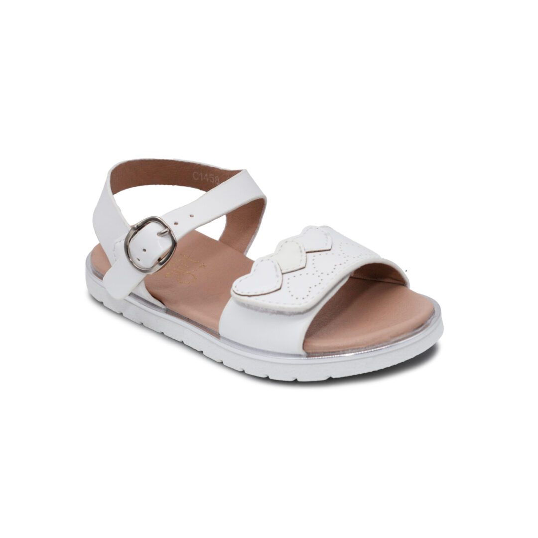 Sandalias palanas de niña blancas con cierre de hebilla al tobillo, cierre de velcro con corazones y planta acolchada.