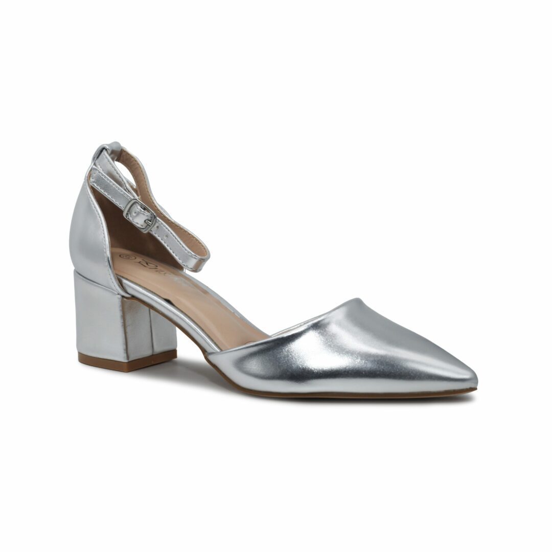 Estos tacones en color plata están compuestas por una cómoda planta acolchada, un acabado en punta y un tacón ancho de 5,5 cm de altura.