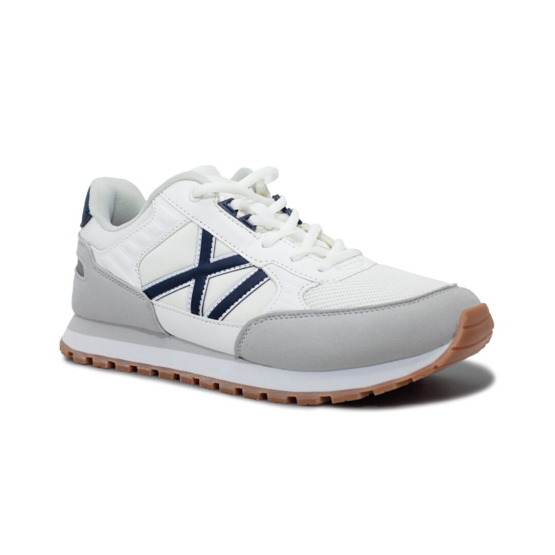 Zapatillas de hombre de estilo casual-deportivo en tonos blanco y azul marino. Incorporan una cómoda plantilla extraíble, interior acolchado y suela de goma con buen agarre, ideales para el uso diario gracias a su ligereza y confort.