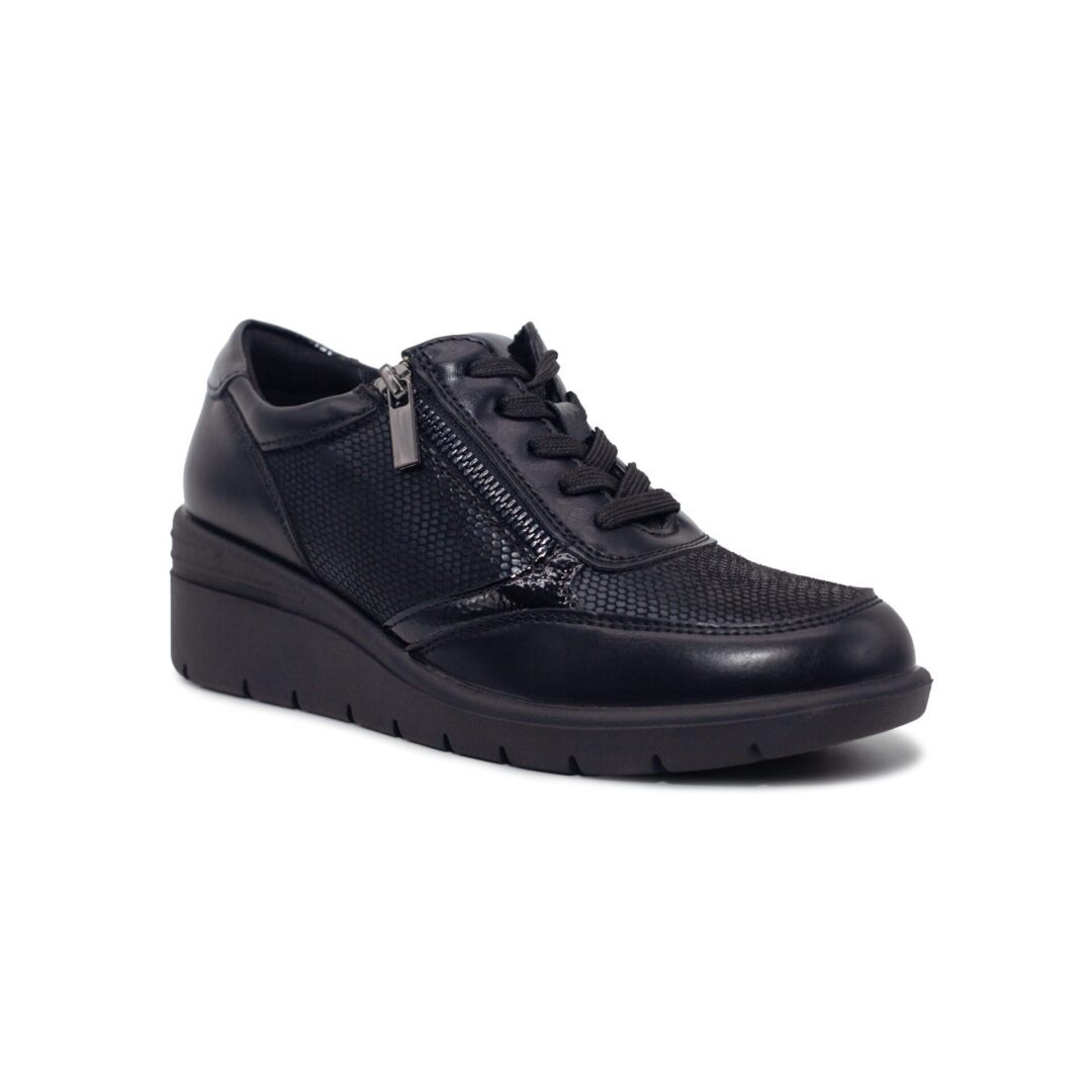 Zapatos de mujer en color negro, diseñados para brindar confort y estilo en el día a día. Cuentan con una pequeña cuña de 5 cm. Además, su cierre clásico de cordones permite un ajuste seguro y personalizado, mientras que la cremallera lateral, de carácter decorativo, añade un toque moderno y elegante al diseño.