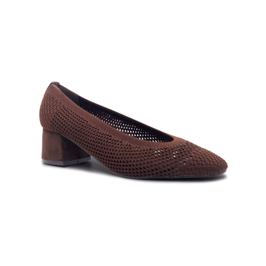 Zapato de mujer en color café con diseño de tejido calado que aporta frescura y estilo. Cuenta con tacón ancho de 4 cm que brinda estabilidad y comodidad, además de planta acolchada para una pisada suave durante todo el día.